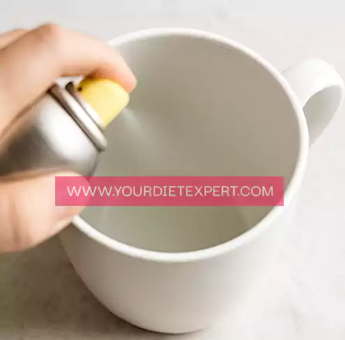 Spray your mug lightly with olive oil or nonstick spray. This ensures your cake doesn’t stick and stays fluffy all around.