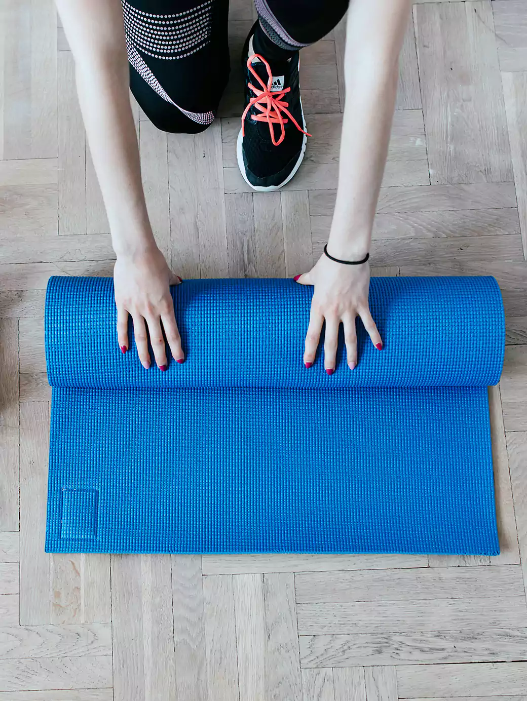 Routine: Gentle yoga flow — cat/cow, low-lunge, pigeon (hip), child’s pose; 5 minutes guided breathing. Finish with a 20-minute walk outside if possible.