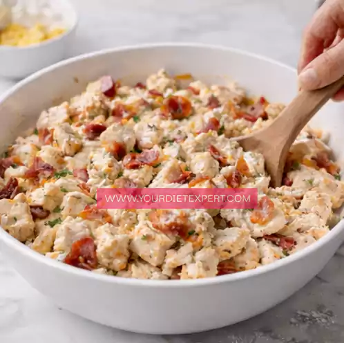Once the chicken and turkey bacon are fully coated in the creamy ranch mixture, transfer everything into the prepared baking dish. Use your spatula to spread the mixture evenly, making sure the chicken is distributed throughout rather than clumped in one area. This even layering is important because it ensures every serving has the same balance of protein, sauce, and flavor.