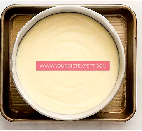 - Line an 8-inch round cake pan or springform pan with parchment paper. Make sure the bottom is fully covered to prevent sticking. Pour the cheesecake batter into the pan and smooth the top with a spatula so it bakes evenly.