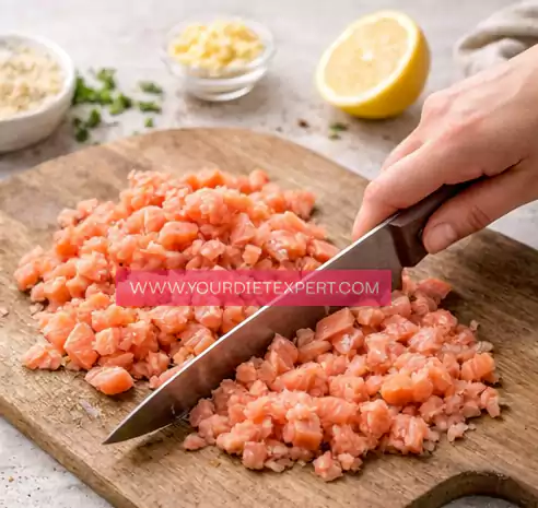 Finely chop the salmon using a knife or pulse it briefly in a food processor. Avoid over-processing—it should be slightly chunky for better texture.