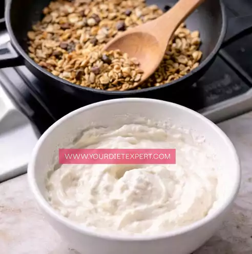 The foundation of this bowl is built around protein-forward ingredients, not sugar-heavy granola or low-protein yogurt. Instead of relying on quick carbs, the recipe uses a creamy, high-protein base that slows digestion, keeps blood sugar stable, and supports muscle repair — especially important for anyone training regularly or trying to maintain lean mass.