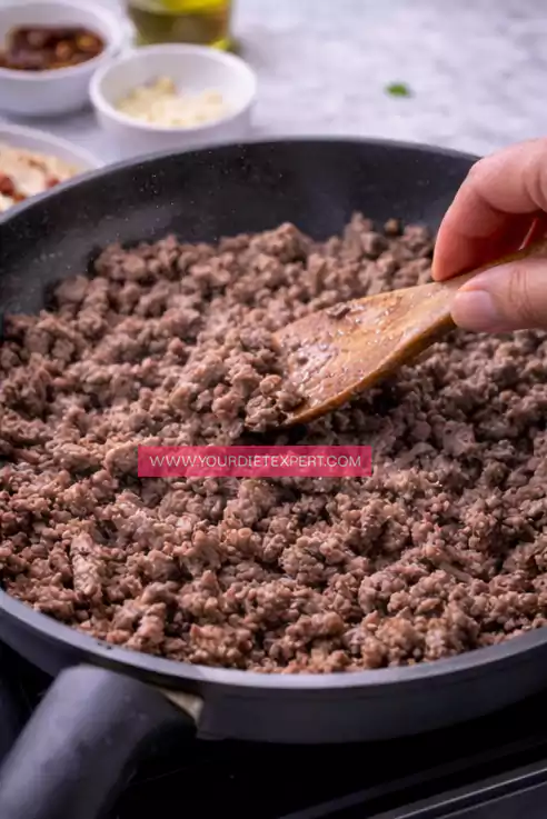Start by heating a skillet over medium heat. Add the ground beef and break it up gently as it cooks. Season lightly so the meat stays flavorful but not overpowering.
