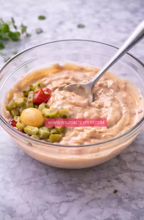 While the protein cooks, mix Greek yogurt with ketchup, mustard, finely chopped pickles, and a splash of pickle juice. Stir until smooth and creamy, then set aside so the flavors can meld.