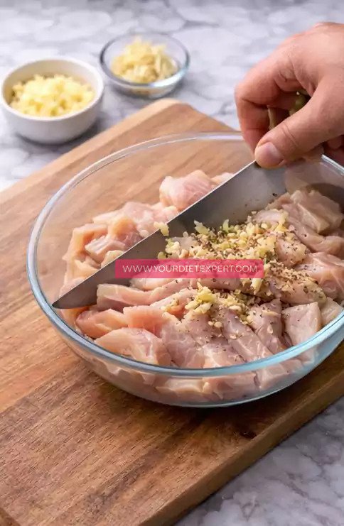 Begin by slicing the chicken breast into thin, even strips. Keeping the pieces uniform ensures fast cooking and prevents dryness. Place the chicken in a mixing bowl and season lightly with black pepper, half of the minced garlic, and half of the grated ginger. Let it rest while you prepare the vegetables so the flavors can absorb.