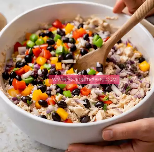 - Add the black beans, diced bell peppers, and finely chopped red onion to the bowl. Fold everything together gently, lifting from the bottom and turning over slowly so the vegetables stay intact and evenly distributed.