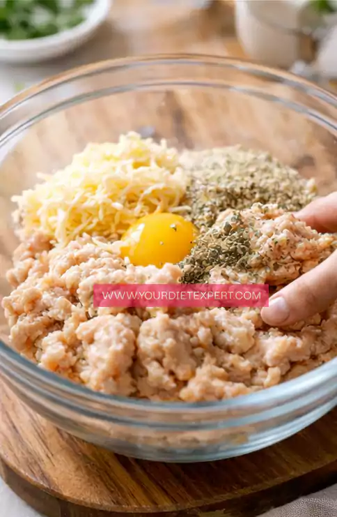 Start by adding ground chicken into a large bowl. Add shredded cheese, almond flour, egg, and optional seasonings. Mix gently until everything is just combined.