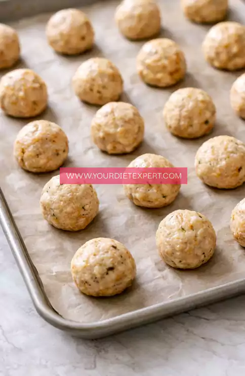 - Line a baking tray with parchment paper and arrange the shaped balls in a single layer. Leave a little space between each one so heat can circulate properly, allowing them to cook evenly and develop a light golden exterior.