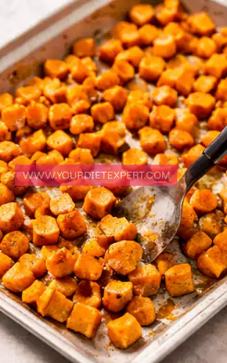- Preheat your oven to 200°C (400°F). Wash, peel, and cut the sweet potatoes into evenly sized cubes so they cook uniformly. Place them on a baking tray, drizzle with olive oil, and season with paprika, garlic powder, salt, and black pepper. Toss everything well to coat, then spread the cubes in a single layer and roast for about 20–25 minutes, flipping halfway through, until they are tender on the inside and slightly crispy on the edges.