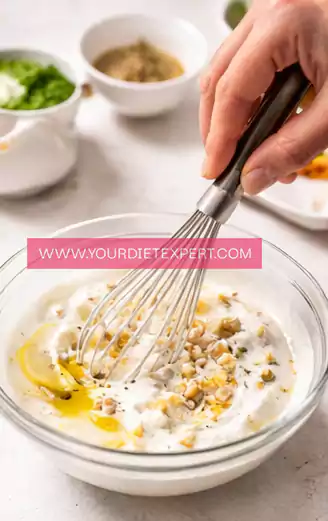 - In a mixing bowl, combine Greek yogurt, minced garlic, lemon juice, olive oil, salt, and black pepper. Stir or whisk until the mixture becomes smooth and creamy, making sure the garlic and seasoning are evenly distributed throughout the sauce.