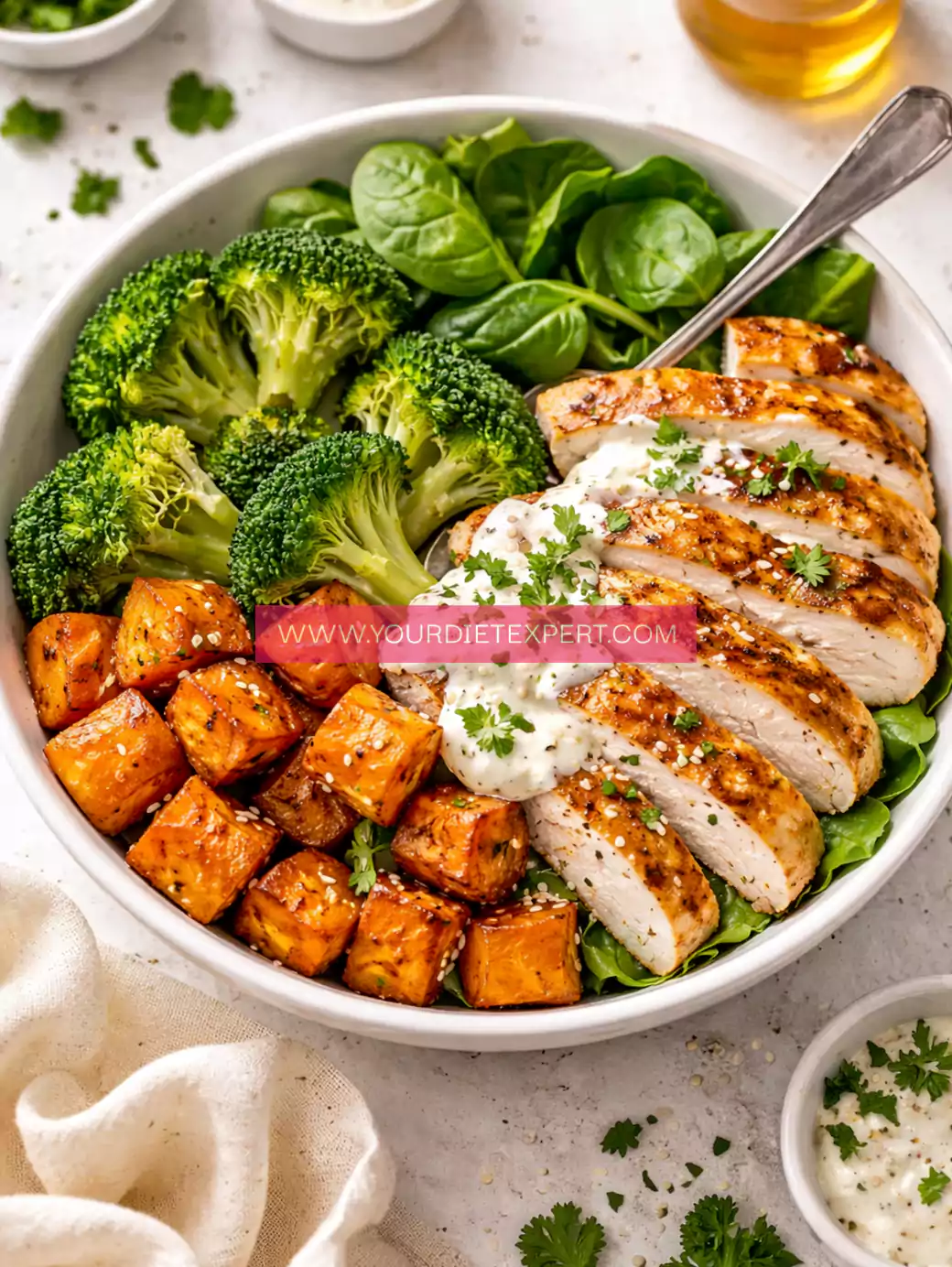 High-Protein Chicken Sweet Potato Power Bowl with Creamy Garlic Sauce Recipe