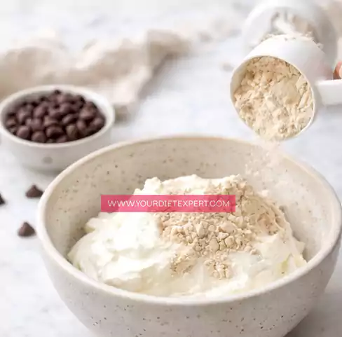 Start by adding Greek yogurt and protein powder into a mixing bowl. Mix gently at first to avoid clumping.
