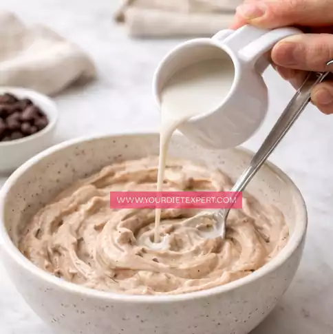 - Begin adding milk little by little while continuing to mix. Don’t pour it all in at once. Stir continuously and watch the texture closely as it transforms into a thick, smooth, and creamy consistency. If it feels too thick, add a tiny splash more milk; if it becomes too thin, you can balance it with a small amount of extra protein powder.