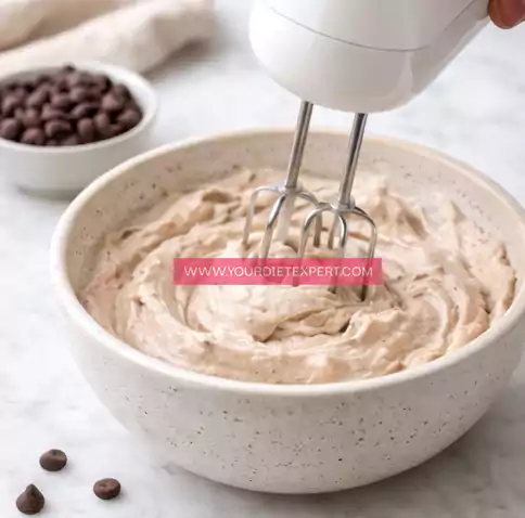 - Once the mixture is smooth, use a whisk or hand mixer to whip it for about 1–2 minutes. This step is what creates that light, airy, mousse-like texture. You’ll notice the mixture becoming fluffier and slightly increased in volume—this is exactly what you want.