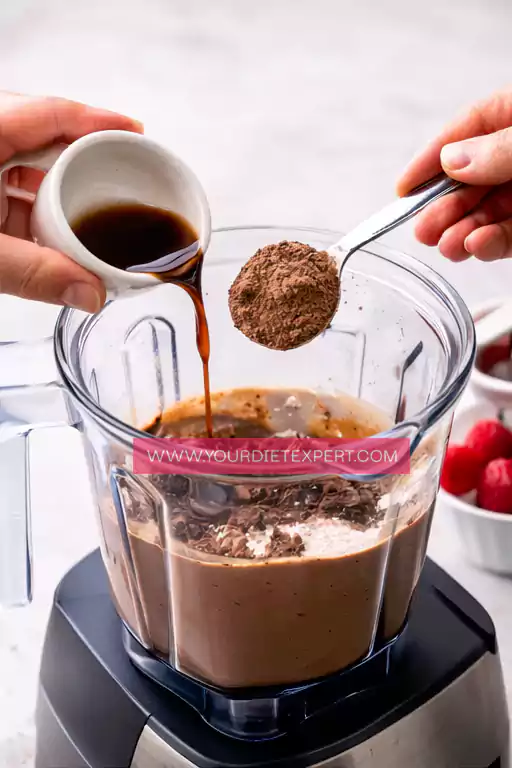 - Once the base is silky, add the unsweetened cocoa powder, your chosen sweetener, and the vanilla extract. Blend again until the cocoa is fully incorporated and the mixture turns a deep, rich chocolate color. Pause to taste at this stage and adjust sweetness if needed, blending briefly after each adjustment so the flavor stays balanced and smooth.