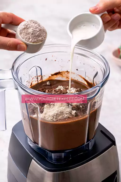 Add cocoa powder, vanilla extract, and your chosen sweetener. Blend again until the mixture turns dark, glossy, and uniform. Pause to taste and adjust sweetness if needed.