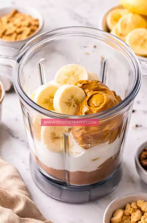 - Add the banana, Greek yogurt, and peanut butter into a blender or food processor. Break the banana into a few pieces before adding so it blends more easily. Start blending on a low speed to combine everything, then increase speed until the mixture becomes thick and creamy with no visible chunks.