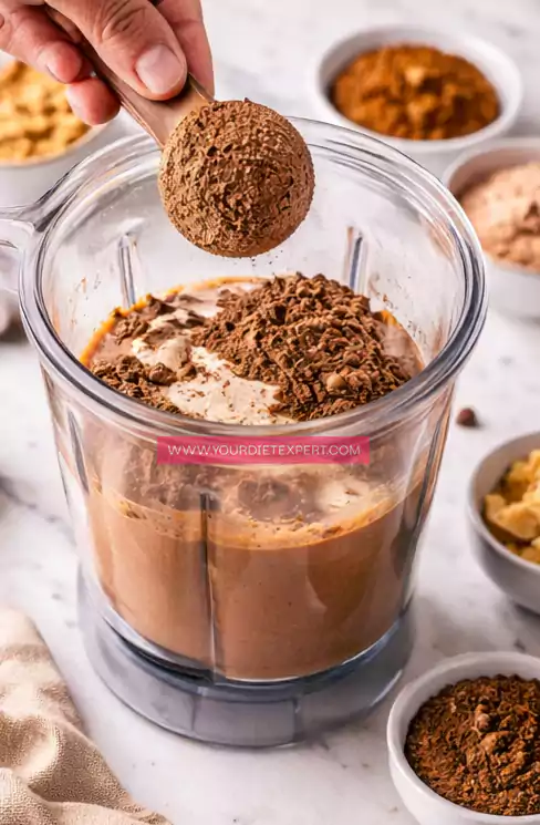 - Add the protein powder and cocoa powder directly into the blender. Blend again, starting slowly so the powders don’t fly up, then increase speed until everything is fully incorporated and the mixture turns into a rich, chocolatey base.