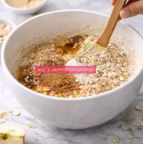 - Add the oats, protein powder, cinnamon, baking powder, and salt to the bowl. Using a spatula or wooden spoon, gently mix until the dry ingredients are just incorporated into the wet mixture. Avoid overmixing at this stage to keep the bars tender and moist.