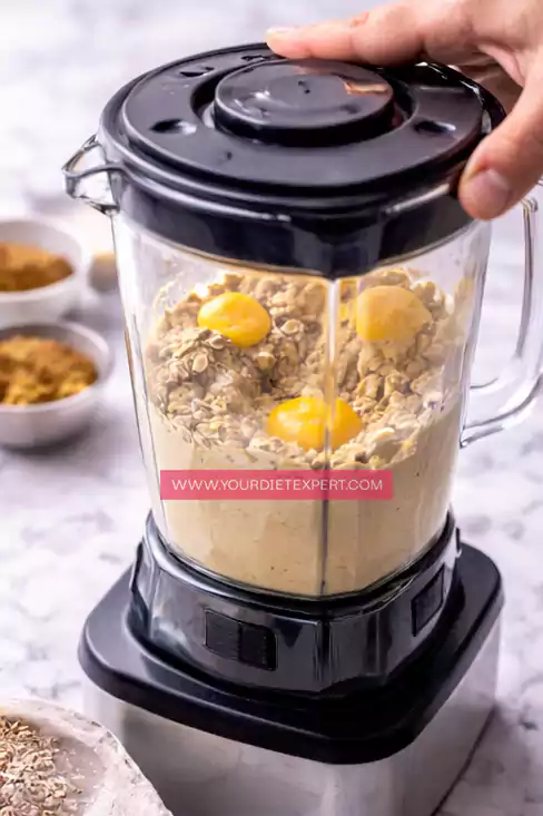 - Add the cottage cheese, ripe banana, eggs, oats, baking powder, cinnamon, vanilla extract, and salt to a blender. Blend on medium to high speed until the mixture becomes completely smooth and uniform, stopping once or twice to scrape down the sides if needed. The batter should look creamy and thick, but still be easy to pour.