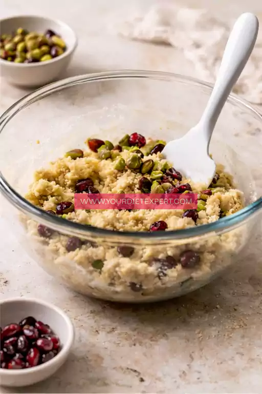 - Add the dried cranberries and chopped pistachios into the dough. Fold them in carefully using a spatula, making sure they are evenly distributed throughout so each cookie has a balanced mix of texture and flavor.