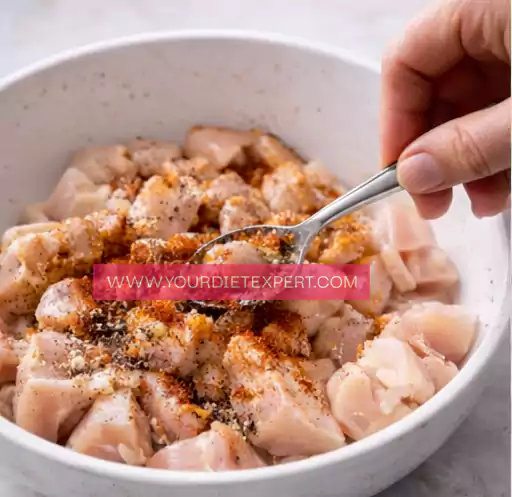 Begin by cutting the chicken breast into small, evenly sized pieces. Keeping the pieces uniform ensures they cook at the same rate and stay tender instead of drying out. Season the chicken with salt, black pepper, and paprika, tossing well so every piece is evenly coated.