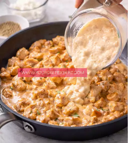 Return the skillet to medium-low heat and add the creamy sauce mixture. Stir gently and let it warm through for a minute or two. Avoid high heat, as overheating dairy-based sauces can cause separation.
