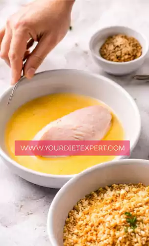 - Transfer the egg-coated chicken into a separate bowl or plate containing the breadcrumb mixture. Press the breadcrumbs gently onto both sides of the chicken, ensuring an even, well-coated layer for that crispy texture.
