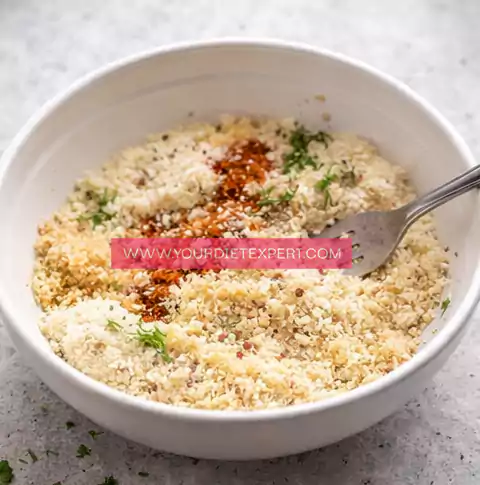 - While the chicken is marinating, take a separate bowl and add the almond flour, grated parmesan, and spices. Mix everything well until the coating is evenly combined, with no clumps, so each piece of chicken gets a consistent crispy layer.