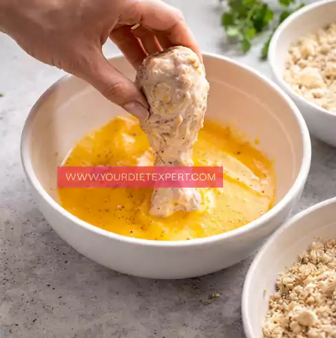 - After marination, dip each piece of chicken into a bowl of beaten egg, making sure it is fully coated. Then transfer it into the dry mixture and press gently so the coating sticks well on all sides. Take your time to ensure an even coating for the best crispiness.