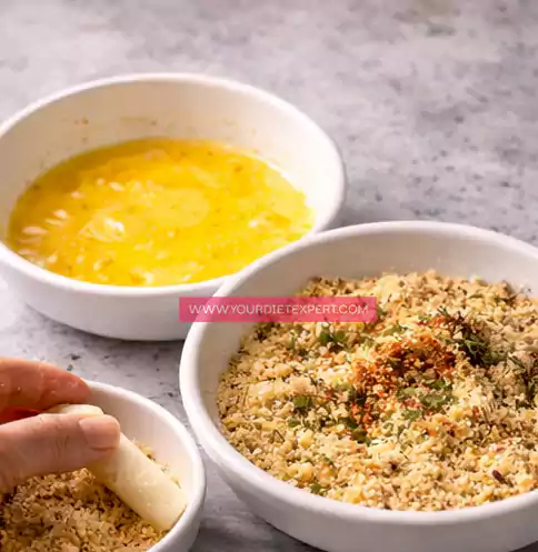- Transfer the coated stick into the breadcrumb mixture and press gently so the coating sticks evenly on all sides.