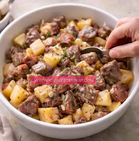 - Place the cubed steak and diced potatoes into a large mixing bowl, then drizzle with the olive oil and add the minced garlic, diced onion, and all seasonings. Use clean hands or a large spoon to gently toss everything together until the steak and potatoes are evenly coated, making sure the seasoning is distributed well so every bite is flavorful.