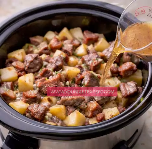 Lightly grease the inside of your slow cooker to prevent sticking. Add the seasoned steak and potato mixture directly into the crockpot, spreading it out into an even layer. Pour the beef broth over the top, allowing it to settle between the pieces. This liquid provides just enough moisture to help everything cook gently while creating a flavorful base.