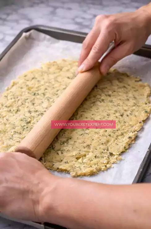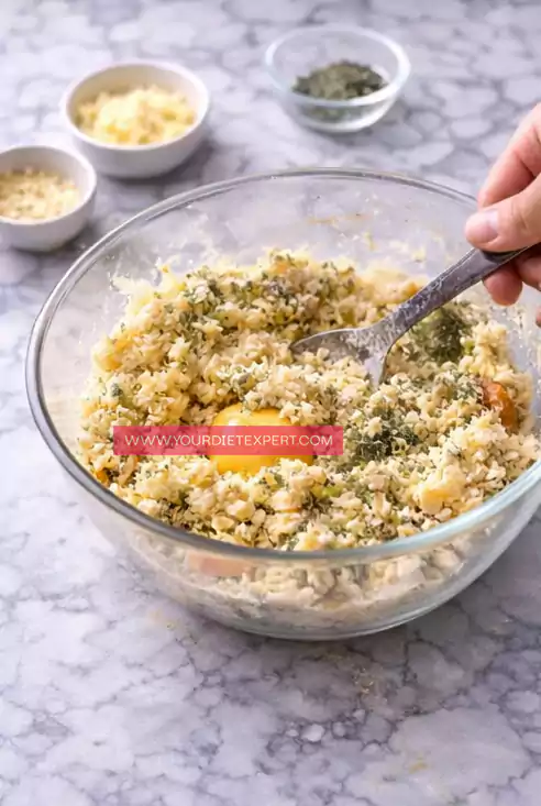Start by adding the protein base, grated Parmesan, egg, garlic powder, herbs, salt, and pepper to a large mixing bowl. Stir thoroughly until a cohesive dough forms. The mixture should feel slightly tacky but not wet. If it feels overly soft, let it rest for a few minutes to firm up.