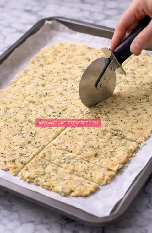 Use a sharp knife or pizza cutter to score the dough into cracker-sized squares or rectangles. Cutting before baking allows for clean edges and even crisping.