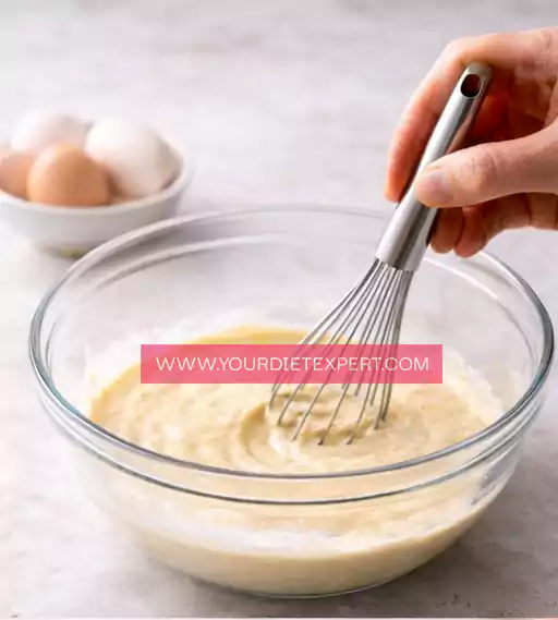 A whisk or sturdy fork helps blend the Greek yogurt and eggs smoothly, incorporating air that contributes to fluffiness.