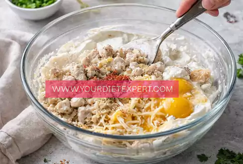 - In a large bowl, mix cooked chicken, Greek yogurt, eggs, garlic, salt, pepper, and smoked paprika until well combined.