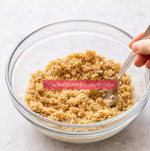 - Add the almond flour, melted coconut oil, and sweetener into a mixing bowl. Use a spoon or spatula to combine everything slowly until the mixture becomes evenly crumbly and slightly moist. Make sure there are no dry patches of almond flour left, as this helps the crust hold together properly.