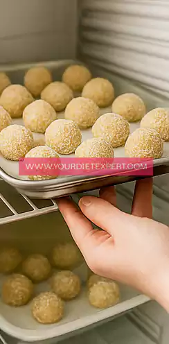 - Place the rolled balls on a plate or tray and chill them in the refrigerator for 15–20 minutes. This helps the dough firm up, enhances the flavor, and creates a better bite when you eat them.