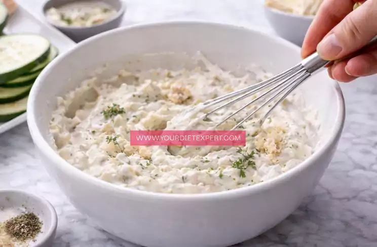 In a bowl, whisk together Greek yogurt, grated Parmesan, garlic, and seasonings until smooth and creamy. The mixture should be thick but spreadable.