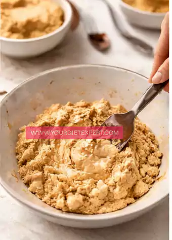 - Add the powdered peanut butter and Greek yogurt to a mixing bowl, then begin combining them slowly using a spoon or spatula. Keep mixing until the texture transforms into a thick, soft dough that holds together easily. If the mixture feels too dry or crumbly, add a small spoon of yogurt and mix again until smooth and workable.