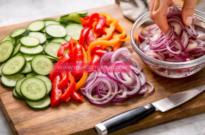 - Thoroughly wash the cucumbers, bell peppers, and red onion, then pat them completely dry with a clean kitchen towel. Thinly slice the cucumbers into rounds and the bell peppers and onion into even strips. Place all the sliced vegetables into a large bowl or a glass storage container so there’s enough room to mix without crushing them.