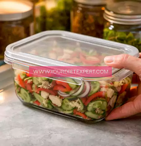 Glass works best for pickled salads because it doesn’t absorb odors or flavors. An airtight container keeps the vegetables crisp and the protein fresh during storage.