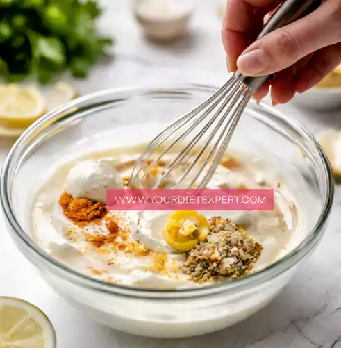 - In a separate mixing bowl, add the Greek yogurt, cream or milk, egg, minced garlic, and all the spices. Begin whisking slowly, then continue until the mixture becomes smooth, creamy, and fully combined with no visible streaks of egg or lumps.