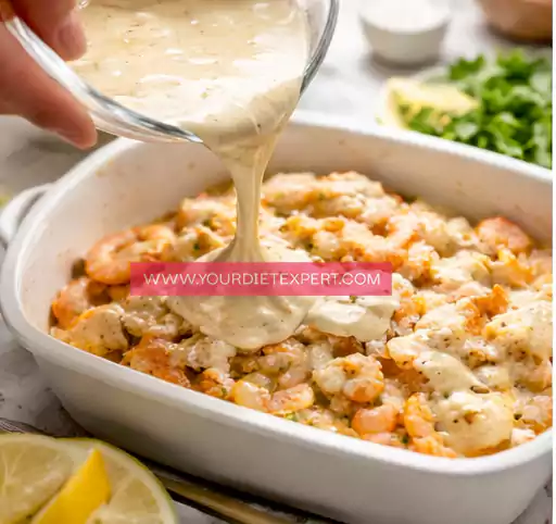 - Pour the prepared sauce over the seafood, using a spoon or spatula to gently spread it if needed, making sure every piece is evenly coated for maximum flavor and creaminess.
