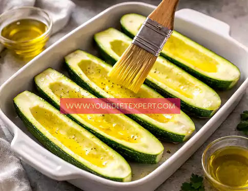 - Arrange the zucchini halves in a baking dish, cut side facing up. Place them in a preheated oven at 180°C (350°F) and bake for about 10 minutes. This step helps soften the zucchini slightly so it becomes tender but still firm enough to hold the filling.