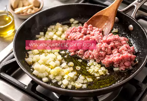 Heat olive oil in a pan, sauté onion and garlic, then add ground chicken. Cook until browned.