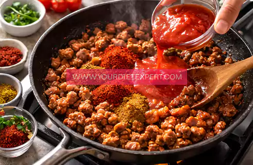 - Once the chicken is fully cooked, add paprika, cumin, chili powder, salt, and pepper to the pan. Pour in the tomato sauce and stir everything together well. Let the mixture simmer for a few minutes so the flavors blend and the sauce thickens slightly.