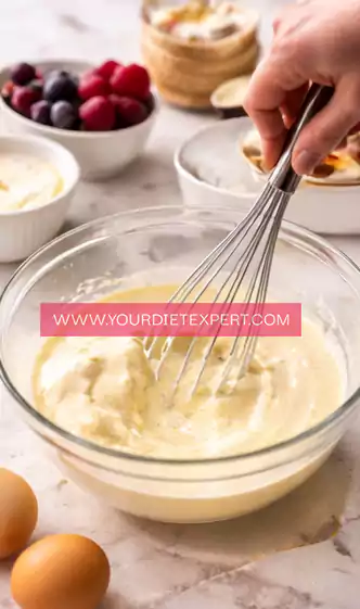 In a bowl, whisk milk, yogurt, eggs, protein powder, sweetener, and vanilla until smooth.