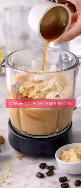 Blend everything on high speed for 20–30 seconds until completely smooth and lightly frothy. Proper blending is key here. It fully dissolves the protein powder, prevents graininess, and creates that creamy café-style texture without cream or sugar.